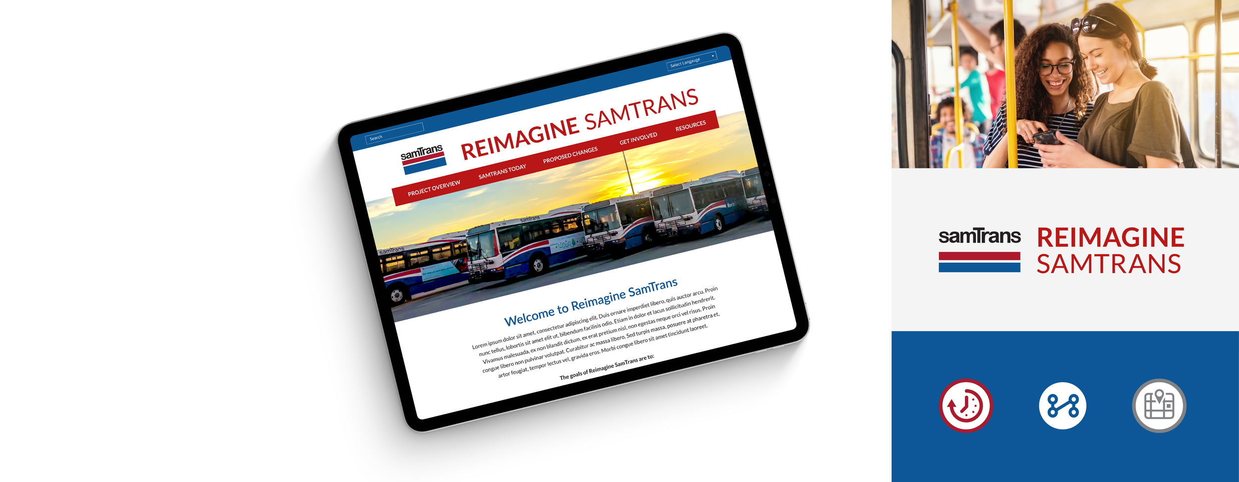 Reimagine SamTrans is a comprehensive operational analysis project established by the San Mateo County Transit District, to evaluate and refresh the entire SamTrans bus system. The website is a part of public outreach support and is intended to inform the community about project benefits, the multiple phases, and community meetings.